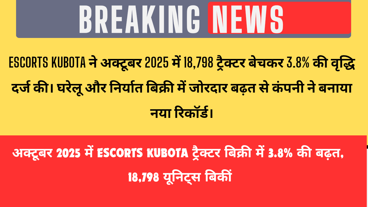 एस्कॉर्ट्स कुबोटा ने दर्ज की 3.8% की बिक्री वृद्धि — अक्टूबर 2025 में 18,798 ट्रैक्टरों की रिकॉर्ड बिक्री फरीदाबाद, 01 नवम्बर 2025: देश की अग्रणी कृषि मशीनरी कंपनी एस्कॉर्ट्स कुबोटा लिमिटेड (Escorts Kubota Limited) ने अक्टूबर 2025 में शानदार प्रदर्शन करते हुए कुल 18,798 ट्रैक्टरों की बिक्री दर्ज की है। यह पिछले वर्ष अक्टूबर 2024 में बेचे गए 18,110 ट्रैक्टरों की तुलना में 3.8% की वृद्धि को दर्शाता है। कंपनी ने बताया कि यह अब तक का उसका सर्वाधिक मासिक बिक्री आंकड़ा है, जो भारतीय कृषि क्षेत्र में एस्कॉर्ट्स कुबोटा की मजबूत उपस्थिति और किसान समुदाय के बढ़ते भरोसे को दर्शाता है। 🎯 घरेलू बाजार में स्थिर वृद्धि कंपनी की घरेलू बिक्री अक्टूबर 2025 में 18,423 यूनिट्स तक पहुंची, जो पिछले वर्ष की इसी अवधि में बेचे गए 17,839 ट्रैक्टरों की तुलना में 3.3% की बढ़ोतरी है। कंपनी ने बताया कि इस वृद्धि का मुख्य कारण त्योहारी सीजन की शुरुआती मांग, सरकार की कृषि क्षेत्र में निरंतर सहायता, जीएसटी दरों में कमी, और अनुकूल कृषि परिस्थितियाँ रहीं। इन सभी कारणों से ग्रामीण बाजारों में ट्रैक्टरों की मांग में मजबूती देखने को मिली है। 🌍 निर्यात में जबरदस्त उछाल एस्कॉर्ट्स कुबोटा ने अंतरराष्ट्रीय बाजार में भी अपनी मजबूत पकड़ बनाए रखी है। अक्टूबर 2025 में कंपनी ने 375 ट्रैक्टरों का निर्यात किया, जो पिछले वर्ष अक्टूबर 2024 में निर्यात किए गए 271 ट्रैक्टरों की तुलना में 38.4% की बढ़ोतरी है। यह दर्शाता है कि एस्कॉर्ट्स कुबोटा के उत्पाद न केवल भारत में बल्कि वैश्विक स्तर पर भी किसानों की पहली पसंद बनते जा रहे हैं। विवरण FY26 (अक्टूबर 2025) FY25 (अक्टूबर 2024) % परिवर्तन घरेलू बिक्री 18,423 17,839 3.3% निर्यात 375 271 38.4% कुल बिक्री 18,798 18,110 3.8% 📈 अप्रैल से अक्टूबर 2025 तक 11.8% की कुल वृद्धि एस्कॉर्ट्स कुबोटा लिमिटेड (जिसके अंतर्गत Farmtrac, Powertrac, और Kubota ब्रांड्स आते हैं) ने अप्रैल से अक्टूबर 2025 की सात महीने की अवधि में कुल 83,256 ट्रैक्टरों की बिक्री की है। यह पिछले वर्ष की समान अवधि में दर्ज 74,475 यूनिट्स की तुलना में 11.8% की वृद्धि को दर्शाता है। इस अवधि में घरेलू बिक्री 10.5% बढ़कर 79,600 ट्रैक्टरों तक पहुंची, जबकि निर्यात में शानदार 48.7% की उछाल देखने को मिली, जो 2,459 यूनिट्स से बढ़कर 3,656 यूनिट्स हो गई। अवधि: अप्रैल–अक्टूबर (7 महीने) FY26 (2025) FY25 (2024) % परिवर्तन घरेलू बिक्री 79,600 72,016 10.5% निर्यात 3,656 2,459 48.7% कुल बिक्री 83,256 74,475 11.8% 💬 कंपनी का दृष्टिकोण एस्कॉर्ट्स कुबोटा लिमिटेड के प्रवक्ता ने कहा, “त्योहारी सीजन के दौरान मजबूत मांग, अच्छी मानसूनी स्थिति और सरकारी योजनाओं के सकारात्मक प्रभाव से हमारे बिक्री परिणाम बेहतर हुए हैं। हमें विश्वास है कि आने वाले महीनों में भी यह सकारात्मक रुझान जारी रहेगा और हम भारतीय किसानों के लिए बेहतर तकनीक और टिकाऊ ट्रैक्टर उपलब्