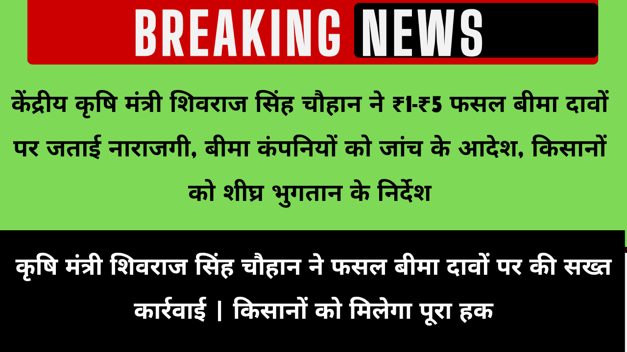केंद्रीय कृषि मंत्री श्री शिवराज सिंह चौहान ने फसल बीमा दावों पर किसानों की शिकायतों को गंभीरता से लिया, दिल्ली में की उच्च स्तरीय बैठक – बीमा कंपनियों और अधिकारियों को दिए सख्त निर्देश केंद्रीय कृषि एवं किसान कल्याण तथा ग्रामीण विकास मंत्री श्री शिवराज सिंह चौहान ने सोमवार को नई दिल्ली स्थित कृषि भवन में एक उच्च स्तरीय बैठक की, जिसमें किसानों द्वारा फसल बीमा दावों को लेकर की जा रही शिकायतों पर विस्तृत चर्चा की गई। बैठक का मुख्य उद्देश्य था – प्रधानमंत्री फसल बीमा योजना (PMFBY) से संबंधित अनियमितताओं और अत्यंत कम राशि वाले दावों की वास्तविकता का पता लगाना तथा किसानों को न्याय दिलाना। बैठक के दौरान श्री चौहान ने महाराष्ट्र के किसानों से वर्चुअल माध्यम से संवाद किया और उनकी शिकायतें प्रत्यक्ष रूप से सुनीं। किसानों ने बताया कि उन्हें फसल बीमा दावे के रूप में ₹1, ₹3, ₹5 या ₹21 जैसी अत्यंत मामूली रकम मिली है, जिससे किसान समुदाय में असंतोष फैला हुआ है। इस पर नाराजगी व्यक्त करते हुए श्री चौहान ने कहा, “₹1, ₹3, ₹5 जैसे दावे किसानों के साथ मज़ाक हैं। सरकार इसे सहन नहीं करेगी। इस पूरे मामले की पूर्ण जांच कराई जाएगी।” उन्होंने बीमा कंपनियों और संबंधित अधिकारियों को कड़ी चेतावनी देते हुए स्पष्ट निर्देश दिए कि किसानों को किसी भी परिस्थिति में परेशान न किया जाए और सभी दावों का शीघ्र और एकमुश्त भुगतान सुनिश्चित किया जाए। 🔹 फसल बीमा के नाम पर मज़ाक नहीं चलेगा – चौहान कृषि मंत्री ने कहा कि प्रधानमंत्री श्री नरेंद्र मोदी के नेतृत्व में शुरू की गई प्रधानमंत्री फसल बीमा योजना किसानों के हित में एक अत्यंत लाभकारी योजना है, जिसका उद्देश्य प्राकृतिक आपदाओं के कारण फसल क्षति की भरपाई करना है। लेकिन कुछ जगहों पर सामने आए ऐसे मामलों से इस योजना की छवि धूमिल हो रही है। उन्होंने कहा, “फसल बीमा योजना किसानों की सुरक्षा कवच है, न कि किसी के लिए मज़ाक का विषय। जो लोग इसे बदनाम कर रहे हैं या लापरवाही बरत रहे हैं, उनके खिलाफ सख्त कार्रवाई होगी।” 🔹 सेhore और महाराष्ट्र के किसानों की शिकायतों पर विशेष ध्यान श्री चौहान ने बताया कि मध्यप्रदेश के सीहोर जिले और महाराष्ट्र के अकोला जिले से किसानों की कई शिकायतें प्राप्त हुई हैं। कुछ किसानों का नुकसान “शून्य प्रतिशत” दर्शाया गया, जबकि उन्हें ₹1 का दावा मिला। एक अन्य किसान का नुकसान 0.004806 प्रतिशत दिखाया गया, और दावा राशि भी ₹1 रही। उन्होंने सवाल उठाया – “जब किसान की फसल नष्ट हुई है, तो सर्वेक्षण में ‘शून्य नुकसान’ कैसे दर्शाया गया? क्या यह किसानों के साथ अन्याय नहीं है?” इस पर उन्होंने सीहोर जिले के कलेक्टर को बैठक में वर्चुअल रूप से जोड़ा और सभी संबंधित अधिकारियों व बीम