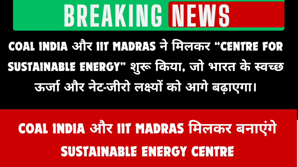 कोल इंडिया लिमिटेड और आईआईटी मद्रास ने मिलकर स्थापित किया “सेंटर फॉर सस्टेनेबल एनर्जी” — भारत की स्वच्छ ऊर्जा क्रांति की दिशा में ऐतिहासिक पहल