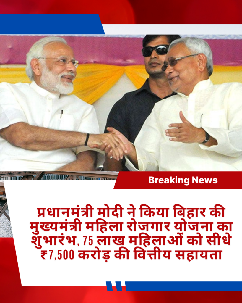 प्रधानमंत्री श्री नरेंद्र मोदी जी 26 सितंबर 2025 को सुबह समय 11 बजे वीडियो कॉन्फ्रेंसिंग के जरिए बिहार सरकार की महत्वाकांक्षी मुख्यमंत्री महिला रोजगार योजना का आरंभ करेंगे। इस मौके पर प्रधानमंत्री बिहार की 75 लाख महिलाओं के बैंक खातों में सीधे सीधे 10-10 हजार रुपये की वित्तीय सहायता प्रदान करेंगे। इस तरह कुल 7,500 करोड़ रुपये की राशि प्रत्यक्ष लाभ अंतरण (DBT) के माध्यम से लाभभोगी तक पहुंचेगी।
