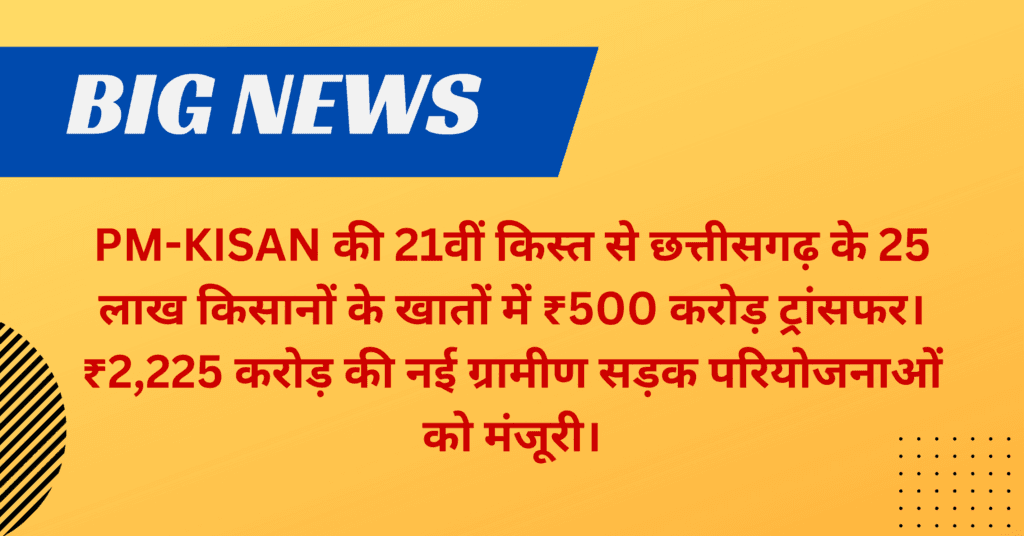 छत्तीसगढ़ के धमतरी में आज किसानों और ग्रामीण विकास से संबंधित कई बड़े निर्णयों की घोषणा की गई, जिनका राज्य के लाखों किसानों पर सीधा सकारात्मक असर होगा। इस राज्य स्तरीय कार्यक्रम में प्रधानमंत्री नरेंद्र मोदी ने कोयंबटूर से प्रधानमंत्री किसान सम्मान निधि (PM-Kisan) की 21वीं किस्त जारी की, जिसके माध्यम से छत्तीसगढ़ के 25 लाख किसानों के बैंक खातों में ₹500 करोड़ की राशि सीधे ट्रांसफर की गई। कार्यक्रम में केंद्रीय कृषि एवं ग्रामीण विकास मंत्री शिवराज सिंह चौहान, मुख्यमंत्री विष्णु देव साय, पूर्व मुख्यमंत्री डॉ. रमन सिंह, और हजारों किसान तथा जनप्रतिनिधि उपस्थित रहे।